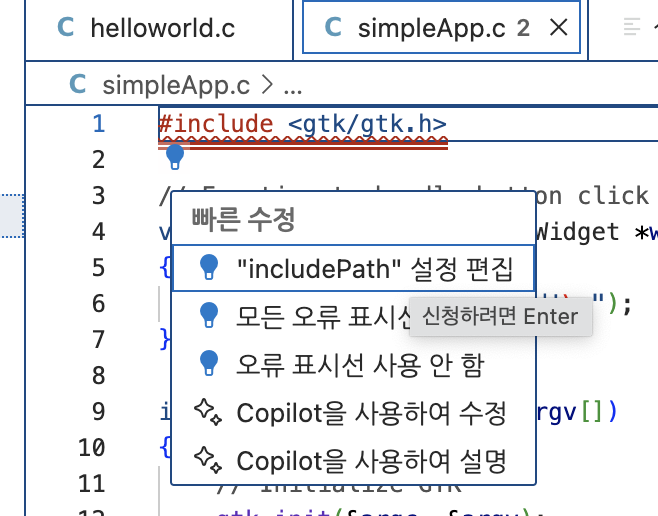 개발환경 컴퓨터 : MacBook Pro 13 M2, 2022년 모델 MacOS Version : Sonoma 14.1.1 IDE : Visual Studio Code v1.85.0 Mac OS 에서 간단한 GUI 응용 프로그램을 예제로 만들려고 하는데, 다음과 같은 에러가 발생했습니다. simpleApp.c:1:10: fatal error: 'gtk/gtk.h' file not found#include 터미널 앱에서 Brew 명령어로 gtk brew install gtk+3 brew install gtk+ 를 설치를 하였지만 같은 에러가 발생하였습니다. Visual Studio Code에서 path를 설정을 해줘야 하는건까요? 'Copilot을 사용하여 수정'을 시도해보았습니다. 똑같이 에러가 발생했습..