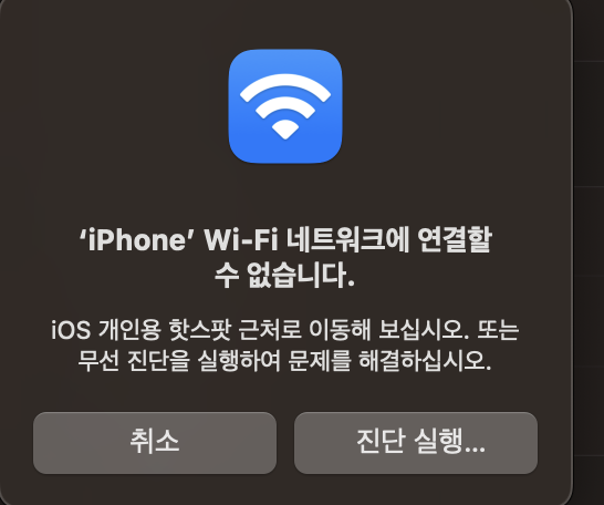 '연결' 버튼을 클릭해서 다음과 같이 'iPhone' Wi-Fi 네트워크에 연결할 수 없습니다.