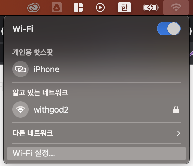 2. 맥북에서 화면 상단에 WiFi 아이콘(안테나 모양)을 클릭합니다.