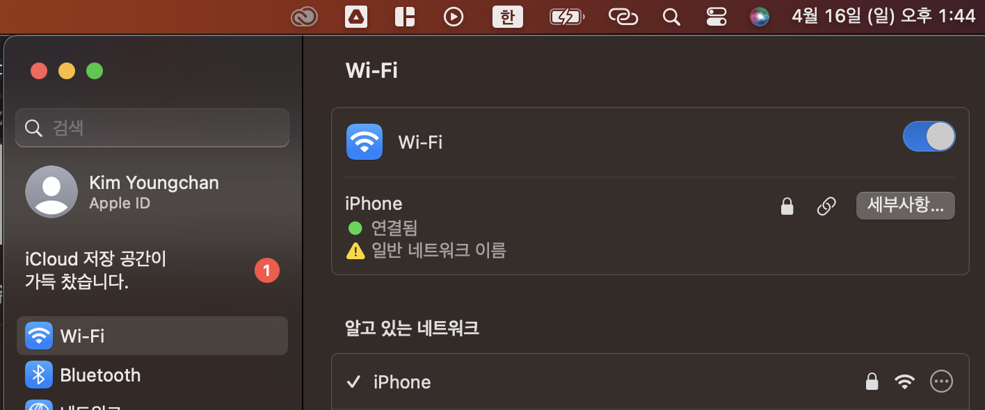 이때 잘 안뜬다면 꼭 현재 아이폰이 설정-개인용 핫스팟 으로 이동했는지를 확인해야 합니다.