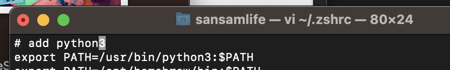 다음 명령어를 통해서 zsh 쉘에 python3 의 경로를 추가해서 python으로 연결해줍니다.