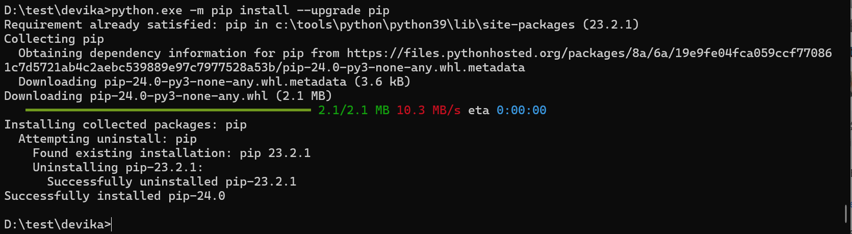 아래와 같이 pip 업데이트가 필요한 경우에는 다음와 명령어로 업데이트해줍니다.