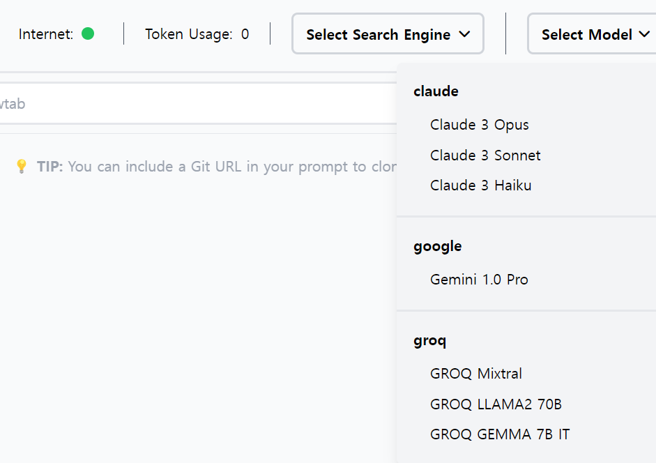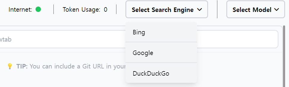화면 오른쪽 상단에 'Select Search Engine' 과 'Select Model'을 선택하는 메뉴가 있습니다.