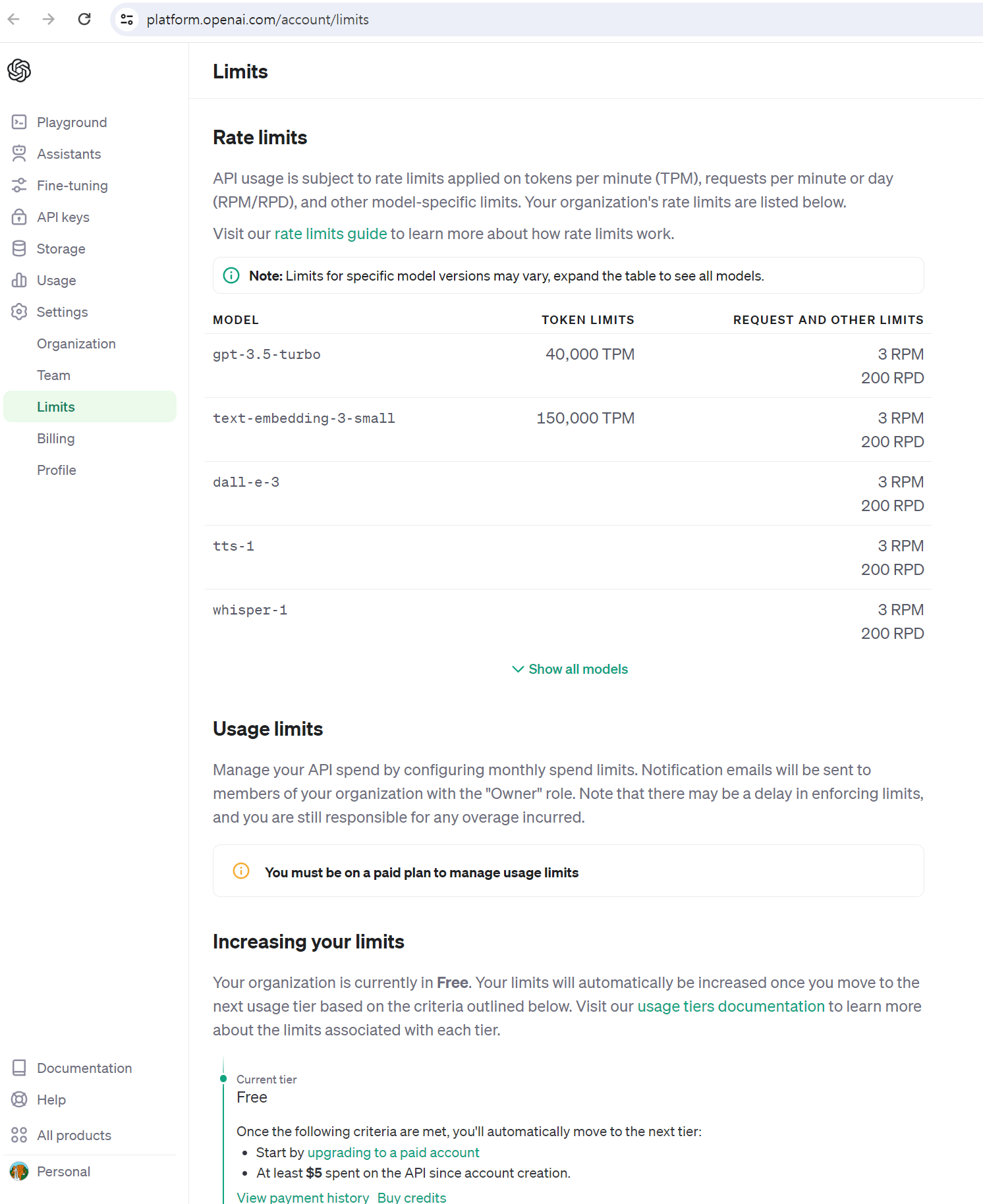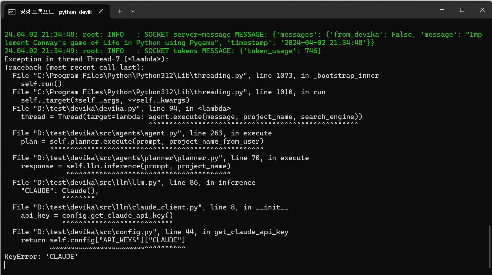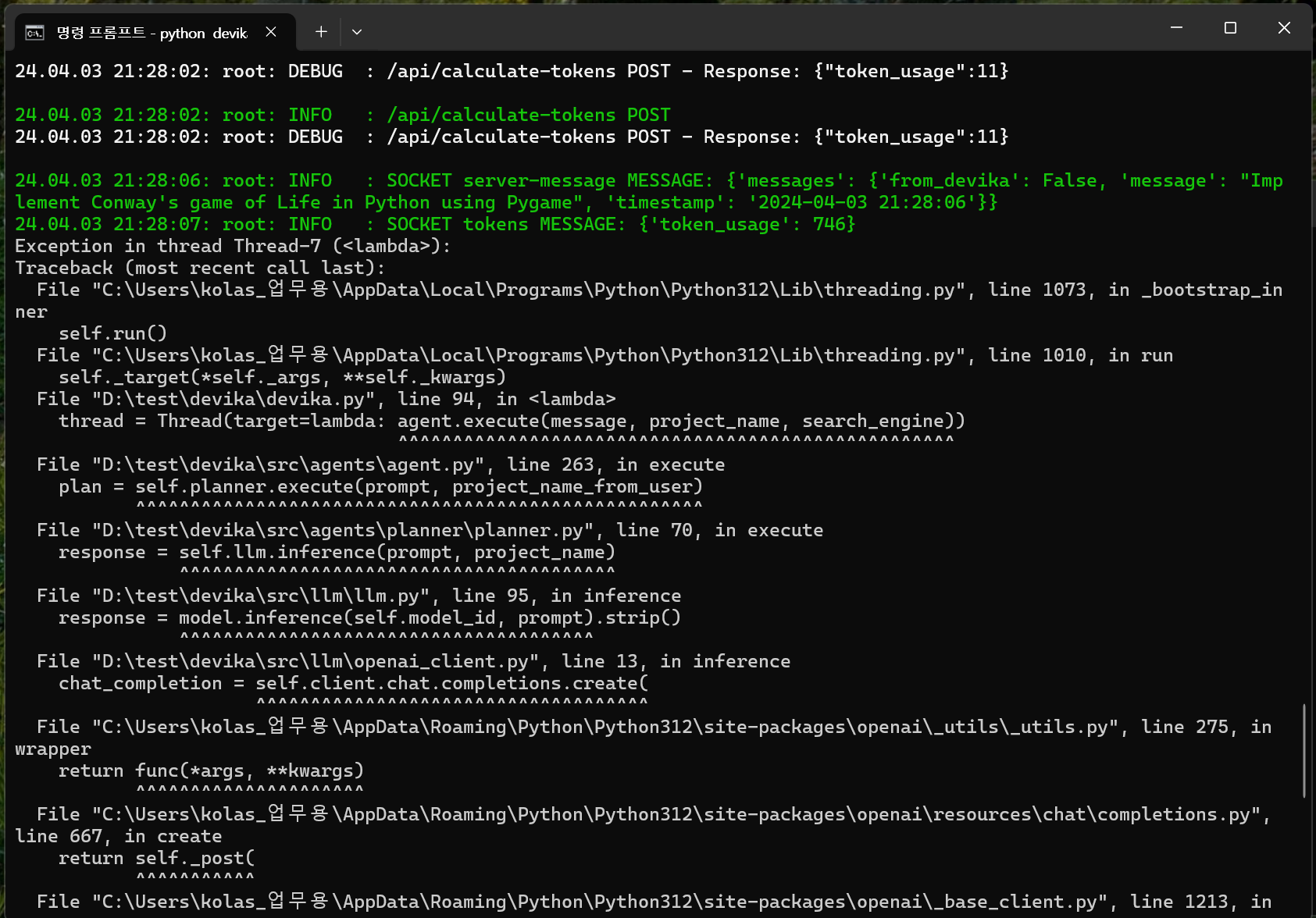| 24.04.03 21:28:06: root: INFO : SOCKET server-message MESSAGE: {'messages': {'from_devika': False, 'message': "Implement Conway's game of Life in Python using Pygame", 'timestamp': '2024-04-03 21:28:06'}} 24.04.03 21:28:07: root: INFO : SOCKET tokens MESSAGE: {'token_usage': 746} Exception in thread Thread-7 (<lambda>): Traceback (most recent call last): File "C:\Users\kolas_업무용\AppData\Local\Programs\Python\Python312\Lib\threading.py", line 1073, in _bootstrap_inner self.run() File "C:\Users\kolas_업무용\AppData\Local\Programs\Python\Python312\Lib\threading.py", line 1010, in run self._target(*self._args, **self._kwargs) File "D:\test\devika\devika.py", line 94, in <lambda> thread = Thread(target=lambda: agent.execute(message, project_name, search_engine)) ^^^^^^^^^^^^^^^^^^^^^^^^^^^^^^^^^^^^^^^^^^^^^^^^^^^ File "D:\test\devika\src\agents\agent.py", line 263, in execute plan = self.planner.execute(prompt, project_name_from_user) ^^^^^^^^^^^^^^^^^^^^^^^^^^^^^^^^^^^^^^^^^^^^^^^^^^^^ File "D:\test\devika\src\agents\planner\planner.py", line 70, in execute response = self.llm.inference(prompt, project_name) ^^^^^^^^^^^^^^^^^^^^^^^^^^^^^^^^^^^^^^^^ File "D:\test\devika\src\llm\llm.py", line 95, in inference response = model.inference(self.model_id, prompt).strip() ^^^^^^^^^^^^^^^^^^^^^^^^^^^^^^^^^^^^^^ File "D:\test\devika\src\llm\openai_client.py", line 13, in inference chat_completion = self.client.chat.completions.create( ^^^^^^^^^^^^^^^^^^^^^^^^^^^^^^^^^^^^ File "C:\Users\kolas_업무용\AppData\Roaming\Python\Python312\site-packages\openai\_utils\_utils.py", line 275, in wrapper return func(*args, **kwargs) ^^^^^^^^^^^^^^^^^^^^^ File "C:\Users\kolas_업무용\AppData\Roaming\Python\Python312\site-packages\openai\resources\chat\completions.py", line 667, in create return self._post( ^^^^^^^^^^^ File "C:\Users\kolas_업무용\AppData\Roaming\Python\Python312\site-packages\openai\_base_client.py", line 1213, in post return cast(ResponseT, self.request(cast_to, opts, stream=stream, stream_cls=stream_cls)) ^^^^^^^^^^^^^^^^^^^^^^^^^^^^^^^^^^^^^^^^^^^^^^^^^^^^^^^^^^^^^^^^^ File "C:\Users\kolas_업무용\AppData\Roaming\Python\Python312\site-packages\openai\_base_client.py", line 902, in request return self._request( ^^^^^^^^^^^^^^ File "C:\Users\kolas_업무용\AppData\Roaming\Python\Python312\site-packages\openai\_base_client.py", line 978, in _request return self._retry_request( ^^^^^^^^^^^^^^^^^^^^ File "C:\Users\kolas_업무용\AppData\Roaming\Python\Python312\site-packages\openai\_base_client.py", line 1026, in _retry_request return self._request( ^^^^^^^^^^^^^^ File "C:\Users\kolas_업무용\AppData\Roaming\Python\Python312\site-packages\openai\_base_client.py", line 978, in _request return self._retry_request( ^^^^^^^^^^^^^^^^^^^^ File "C:\Users\kolas_업무용\AppData\Roaming\Python\Python312\site-packages\openai\_base_client.py", line 1026, in _retry_request return self._request( ^^^^^^^^^^^^^^ File "C:\Users\kolas_업무용\AppData\Roaming\Python\Python312\site-packages\openai\_base_client.py", line 993, in _request raise self._make_status_error_from_response(err.response) from None openai.RateLimitError: Error code: 429 - {'error': {'message': 'You exceeded your current quota, please check your plan and billing details. For more information on this error, read the docs: https://platform.openai.com/docs/guides/error-codes/api-errors.', 'type': 'insufficient_quota', 'param': None, 'code': 'insufficient_quota'}} |