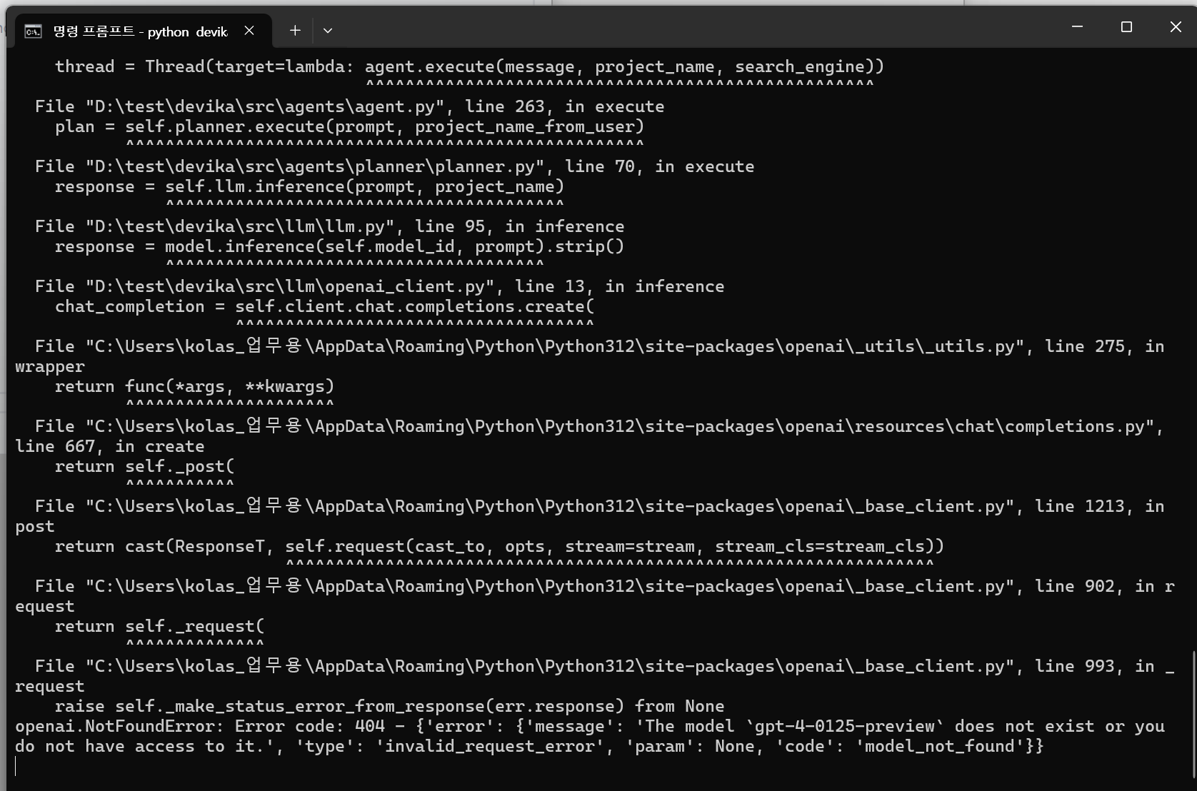 프롬프트 입력이 되지만 또다른 에러가 발생하였습니다.