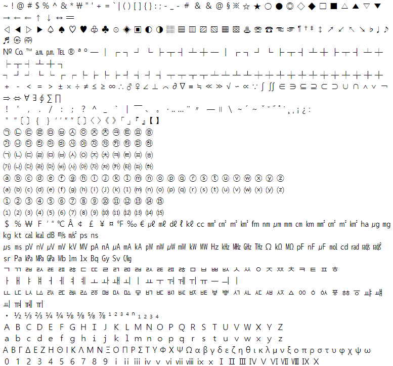 | ~ ! @ # $ % ^ & * \ " ' + = ` | ( ) [ ] { } : ; - _ - # & & @ § ※ ☆ ★ ○ ● ◎ ◇ ◆ □ ■ △ ▲ ▽ ▼ → ← ← ↑ ↓ ↔ 〓 ◁ ◀ ▷ ▶ ♤ ♠ ♡ ♥ ♧ ♣ ⊙ ◈ ▣ ◐ ◑ ▒ ▤ ▥ ▨ ▧ ▦ ▩ ♨ ☏ ☎ ☜ ☞ ¶ † ‡ ↕ ↗ ↙ ↖ ↘ ♭ ♩ ♪ ♬ ㉿ ㈜ № ㏇ ™ ㏂ ㏘ ℡ ® ª º ─ │ ┌ ┐ ┘ └ ├ ┬ ┤ ┴ ┼ ━ ┃ ┏ ┓ ┛ ┗ ┣ ┳ ┫ ┻ ╋ ┠ ┯ ┨ ┷ ┿ ┝ ┰ ┥ ┸ ╂ ┒ ┑ ┚ ┙ ┖ ┕ ┎ ┍ ┞ ┟ ┡ ┢ ┦ ┧ ┩ ┪ ┭ ┮ ┱ ┲ ┵ ┶ ┹ ┺ ┽ ┾ ╀ ╁ ╃ ╄ ╅ ╆ ╇ ╈ ╉ ╊ + - < = > ± × ÷ ≠ ≤ ≥ ∞ ∴ ♂ ♀ ∠ ⊥ ⌒ ∂ ∇ ≡ ≒ ≪ ≫ √ ∽ ∝ ∵ ∫ ∬ ∈ ∋ ⊆ ⊇ ⊂ ⊃ ∪ ∩ ∧ ∨ ¬ ⇒ ⇔ ∀ ∃ ∮ ∑ ∏ ! ' , . / : ; ? ^ _ ` |  ̄ 、 。 · ‥ … ¨ 〃 ― ∥ \ ∼ ´ ~ ˇ ˘ ˝ ˚ ˙ ¸ ˛ ¡ ¿ ː " ” 〔 〕 { } ‘ ’ “ ” 〔 〕 〈 〉 《 》 「 」 『 』 【 】 ㉠ ㉡ ㉢ ㉣ ㉤ ㉥ ㉦ ㉧ ㉨ ㉩ ㉪ ㉫ ㉬ ㉭ ㉮ ㉯ ㉰ ㉱ ㉲ ㉳ ㉴ ㉵ ㉶ ㉷ ㉸ ㉹ ㉺ ㉻ ㈀ ㈁ ㈂ ㈃ ㈄ ㈅ ㈆ ㈇ ㈈ ㈉ ㈊ ㈋ ㈌ ㈍ ㈎ ㈏ ㈐ ㈑ ㈒ ㈓ ㈔ ㈕ ㈖ ㈗ ㈘ ㈙ ㈚ ㈛ ⓐ ⓑ ⓒ ⓓ ⓔ ⓕ ⓖ ⓗ ⓘ ⓙ ⓚ ⓛ ⓜ ⓝ ⓞ ⓟ ⓠ ⓡ ⓢ ⓣ ⓤ ⓥ ⓦ ⓧ ⓨ ⓩ ⒜ ⒝ ⒞ ⒟ ⒠ ⒡ ⒢ ⒣ ⒤ ⒥ ⒦ ⒧ ⒨ ⒩ ⒪ ⒫ ⒬ ⒭ ⒮ ⒯ ⒰ ⒱ ⒲ ⒳ ⒴ ⒵ ① ② ③ ④ ⑤ ⑥ ⑦ ⑧ ⑨ ⑩ ⑪ ⑫ ⑬ ⑭ ⑮ ⑴ ⑵ ⑶ ⑷ ⑸ ⑹ ⑺ ⑻ ⑼ ⑽ ⑾ ⑿ ⒀ ⒁ ⒂ $ % ₩ F ′ ″ ℃ Å ¢ £ ¥ ¤ ℉ ‰ € ㎕ ㎖ ㎗ ℓ ㎘ ㏄ ㎣ ㎤ ㎥ ㎦ ㎙ ㎚ ㎛ ㎜ ㎝ ㎞ ㎟ ㎠ ㎡ ㎢ ㏊ ㎍ ㎎ ㎏ ㏏ ㎈ ㎉ ㏈ ㎧ ㎨ ㎰ ㎱ ㎲ ㎳ ㎴ ㎵ ㎶ ㎷ ㎸ ㎹ ㎀ ㎁ ㎂ ㎃ ㎄ ㎺ ㎻ ㎼ ㎽ ㎾ ㎿ ㎐ ㎑ ㎒ ㎓ ㎔ Ω ㏀ ㏁ ㎊ ㎋ ㎌ ㏖ ㏅ ㎭ ㎮ ㎯ ㏛ ㎩ ㎪ ㎫ ㎬ ㏝ ㏐ ㏓ ㏃ ㏉ ㏜ ㏆ ㄱ ㄲ ㄼ ㄽ ㄾ ㄿ ㅀ ㄷ ㄸ ㄹ ㄺ ㄻ ㄼ ㄽ ㄾ ㄿ ㅀ ㅁ ㅂ ㅃ ㅄ ㅅ ㅆ ㅇ ㅈ ㅉ ㅊ ㅋ ㅌ ㅍ ㅎ ㅏ ㅐ ㅑ ㅒ ㅓ ㅔ ㅕ ㅖ ㅗ ㅘ ㅙ ㅚ ㅣ ㅛ ㅜ ㅝ ㅞ ㅟ ㅠ ㅡ ㅢ ㅣ ㅥ ㅦ ㅧ ㅨ ㅩ ㅪ ㅫ ㅬ ㅭ ㅮ ㅯ ㅰ ㅱ ㅲ ㅳ ㅴ ㅵ ㅶ ㅷ ㅸ ㅹ ㅺ ㅻ ㅼ ㅽ ㅾ ㅿ ㆀ ㆁ ㆂ ㆄ ㆅ ㆆ ㆇ ㆈ ㆉ ㆊ ㆋ ㆌ ㆍ ½ ⅓ ⅔ ¼ ¾ ⅛ ⅜ ⅝ ⅞ ¹ ² ³ ⁴ ⁿ ₁ ₂ ₃ ₄ A B C D E F G H I J K L M N O P Q R S T U V W X Y Z a b c d e f g h i j k l m n o p q r s t u v w x y z Α Β Γ Δ Ε Ζ Η Θ Ι Κ Λ Μ Ν Ξ Ο Π Ρ Σ Τ Υ Φ Χ Ψ Ω α β γ δ ε ζ η θ ι κ λ μ ν ξ ο π ρ σ τ υ φ χ ψ ω 0 1 2 3 4 5 6 7 8 9 ⅰ ⅱ ⅲ ⅳ ⅴ ⅵ ⅶ ⅷ ⅸ ⅹ Ⅰ Ⅱ Ⅲ Ⅳ Ⅴ Ⅵ Ⅶ Ⅷ Ⅸ Ⅹ ꊒ ꊓ ꊔ ꊕ ꊖ ꊗ ꊘ ꊙ ꊚ ꊛ ꊈ ꊉ ꊊ ꊋ ꊌ ꊍ ꊎ ꊏ ꊐ ꊑ ꊦ ꊧ ꊨ ꊩ ꊪ ꊫ ꊬ ꊭ ꊮ ꊯ ꊝ ꊞ ꊟ ꊠ ꊡ ꊢ ꊣ ꊤ ꊥ ꋍ ꋎ ꋏ ꋐ ꋑ ꋒ ꋓ ꋔ ꋕ ꋖ ꋠ ꋡ ꋢ ꋣ ꋤ ꋥ ꋦ ꋧ ꋨ ꋩ ꊰ ꊱ ꊲ ꊳ ꊴ ꊵ ꊶ ꊷ ꊸ ꊹ ꊺ ꊻ ꊼ ꊽ ꊾ ꊿ ꋀ ꋁ ꋂ ꓐ ꓑ ꓒ ꓓ ꓔ ꓕ ꒐ ꒑ ꒒ ꒓ ꒔ ꒕ ꒖ ꒗ ꒘ ꒙ ꒮ ꒯ ꒰ ꒱ ꒲ ꒳ ꒴ ꒵ ꒶ ꒷ ꓂ ꓃ ꓄ ꓅ ꓆ ꓖ ꓗ ꓘ ꓙ ꓚ ꓛ ꓜ ꓝ ꓞ ꓟ ꓪ ꓫ ꓬ ꓭ ꓮ ꓯ ꓰ ꓱ ꓲ ꓳ ꓠ ꓡ ꓢ ꓣ ꓤ ꓥ ꓦ ꓧ ꓨ ꓩ ① ② ③ ④ ⑤ ⑥ ⑦ ⑧ ⑨ ⑩ ⑪ ⑫ ⑬ ⑭ ⑮ ⑴ ⑵ ⑶ ⑷ ⑸ ⑹ ⑺ ⑻ ⑼ ⑽ ⑾ ⑿ ⒀ ⒁ ⒂ ꈂ ꈃ ꈄ ꈅ ꈆ ꈇ ꈈ ꈉ ꈊ ꈋ ꈌ ꈍ ꈎ ꈏ ꈐ ꈑ ꈒ ꈓ ꈔ ꈕ ꉭ ꉮ ꉯ ꉰ ꉱ ꉲ ꉳ ꉴ ꉵ ꉶ ꉷ ꉸ ꉹ ꉺ ꉻ ꉼ ꉽ ꉾ ꉿ ꊀ ꆗ ꆘ ꆙ ꆚ ꆛ ꆜ ꆝ ꆞ ꆟ ꆠ ꆡ ꆢ ꆣ ꆤ ꆥ ꆦ ꆧ ꆨ ꆩ ꆪ ꄽ ꄾ ꄿ ꅀ ꅁ ꅂ ꅃ ꅄ ꅅ ꅆ ㊀ ㊁ ㊂ ㊃ ㊄ ㊅ ㊆ ㊇ ㊈ ㊉ ㈠ ㈡ ㈢ ㈣ ㈤ ㈥ ㈦ ㈧ ㈨ ㈩ ㆒ ㆓ ㆔ ㆕ ㆖ ㆗ ㆘ ㆙ ㆚ ㆛ ꈖ ꈗ ꈘ ꈙ ꈚ ꈛ ꈜ ꊁ ꊂ ꊃ ꊄ ꊅ ꊆ ꊇ ꆫ ꆬ ꆭ ꆮ ꆯ ꆰ ꆱ ㊊ ㊋ ㊌ ㊍ ㊎ ㊏ ㊐ ㈪ ㈫ ㈬ ㈭ ㈮ ㈯ ㈰ ㋀ ㋁ ㋂ ㋃ ㋄ ㋅ ㋆ ㋇ ㋈ ㋉ ㋊ ㋋ ㏠ ㏡ ㏢ ㏣ ㏤ ㏥ ㏦ ㏧ ㏨ ㏩ ㏪ ㏫ ㏬ ㏭ ㏮ ㏯ ㏰ ㏱ ㏲ ㏳ ㏴ ㏵ ㏶ ㏷ ㏸ ㏹ ㏺ ㏻ ㏼ ㏽ ㏾ ㍘ ㍙ ㍚ ㍛ ㍜ ㍝ ㍞ ㍟ ㍠ ㍡ ㍢ ㍣ ㍤ ㍥ ㍦ ㍧ ㍨ ㍩ ㍪ ㍫ ㍬ ㍭ ㍮ ㍯ ㍰ ꆲ ꆳ ꆴ ꆵ ꆶ ꆷ ꆸ ꆹ ꆺ ꆻ ꆼ ꆽ ꆾ ꆿ ꇀ ꇁ ꇂ ꇃ ꇄ ꇅ ꇆ ꇇ ꇈ ꇉ ꇊ ꇋ ꇌ ꇍ ꇎ ꇏ ꇐ ꇑ ꇒ ꇓ ꇔ ꇕ ꇖ ꇗ ꇘ ꇙ ꇚ ꇛ ꇜ ꇝ ꇞ ꇟ ꇠ ꇡ ꇢ ꇣ ꇤ ꇥ ꈝ ꈞ ꈟ ꈠ ꈡ ꈢ ꈣ ꈤ ꈥ ꈦ ꈧ ꈨ ꈩ ꈪ ꈫ ꈬ ꈭ ꈮ ꈯ ꈰ ꈱ ꈲ ꈳ ꈴ ꈵ ꈶ ꈷ ꈸ ꈹ ꈺ ꈻ ꈼ ꈽ ꈾ ꈿ ꉀ ꉁ ꉂ ꉃ ꉄ ꉅ ꉆ ꉇ ꉈ ꉉ ꉊ ꉋ ꉌ ꉍ ꉎ ꉏ ꉐ ꍽ ꍾ ꍿ ꎀ ꎁ ꎂ ꎃ ꎄ ꎅ ꎆ ꎇ ꎈ ꎉ ꎊ ꎋ ꎌ ꎍ ꎎ ꎏ ꎐ ꎑ ꎒ ꎓ ꎔ ꎕ ꎖ ꅇ ꅈ ꅉ ꅊ ꅋ ꅌ ꅍ ꅎ ꅏ ꅐ ꅑ ꅒ ꅓ ꅔ ꅕ ꅖ ꅗ ꅘ ꅙ ꅚ ꅛ ꅜ ꅝ ꅞ ꅟ ꅠ ꅡ ꅢ ꅣ ꅤ ꅥ ꅦ ꅧ ꅨ ꅩ ꅪ ꅫ ꅬ ꅭ ꅮ ꅯ ꅰ ꅱ ꅲ ꅳ ꅴ ꅵ ꅶ ꅷ ꅸ ꅹ ꅺ ⓐ ⓑ ⓒ ⓓ ⓔ ⓕ ⓖ ⓗ ⓘ ⓙ ⓚ ⓛ ⓜ ⓝ ⓞ ⓟ ⓠ ⓡ ⓢ ⓣ ⓤ ⓥ ⓦ ⓧ ⓨ ⓩ ⒜ ⒝ ⒞ ⒟ ⒠ ⒡ ⒢ ⒣ ⒤ ⒥ ⒦ ⒧ ⒨ ⒩ ⒪ ⒫ ⒬ ⒭ ⒮ ⒯ ⒰ ⒱ ⒲ ⒳ ⒴ ⒵ a b c d e f g h i j k l m n o p q r s t u v w x y z ꂛ ꂜ ꂝ ꂞ ꂟ ꂠ ꂡ ꂢ ꂣ ꂤ ꂥ ꂦ ꂧ ꂨ ꆉ ꆊ ꆋ ꆌ ꆍ ꆎ ꆏ ꆐ ꆑ ꆒ ꆓ ꆔ ꆕ ꆖ ꇴ ꇵ ꇶ ꇷ ꇸ ꇹ ꇺ ꇻ ꇼ ꇽ ꇾ ꇿ ꈀ ꈁ ꉟ ꉠ ꉡ ꉢ ꉣ ꉤ ꉥ ꉦ ꉧ ꉨ ꉩ ꉪ ꉫ ꉬ ㉮ ㉯ ㉰ ㉱ ㉲ ㉳ ㉴ ㉵ ㉶ ㉷ ㉸ ㉹ ㉺ ㉻ ㈎ ㈏ ㈐ ㈑ ㈒ ㈓ ㈔ ㈕ ㈖ ㈗ ㈘ ㈙ ㈚ ㈛ ꂩ ꂪ ꂫ ꂬ ꂭ ꂮ ꂯ ꂰ ꂱ ꂲ ꃳ ꃴ ꃵ ꃶ ꃷ ꃸ ꃹ ꃺ ꃻ ꃼ ꇦ ꇧ ꇨ ꇩ ꇪ ꇫ ꇬ ꇭ ꇮ ꇯ ꇰ ꇱ ꇲ ꇳ ꅻ ꅼ ꅽ ꅾ ꅿ ꆀ ꆁ ꆂ ꆃ ꆄ ꆅ ꆆ ꆇ ꆈ ꉑ ꉒ ꉓ ꉔ ꉕ ꉖ ꉗ ꉘ ꉙ ꉚ ꉛ ꉜ ꉝ ꉞ ㈀ ㈁ ㈂ ㈃ ㈄ ㈅ ㈆ ㈇ ㈈ ㈉ ㈊ ㈋ ㈌ ㈍ ㉠ ㉡ ㉢ ㉣ ㉤ ㉥ ㉦ ㉧ ㉨ ㉩ ㉪ ㉫ ㉬ ㉭ ꂳ ꂴ ꂵ ꂶ ꂷ ꂸ ꂹ ꂺ ꂻ ꂼ ꂽ ꂾ ꂿ ꃀ ꃁ ꃂ ꃃ ꃄ ꃅ ꃆ ꃇ ꃈ ꃉ ꃊ ꃋ ꃌ ꃍ ꃎ ꃏ ꃐ ꃑ ꃒ ꃓ ꃔ ꃕ ꃖ 