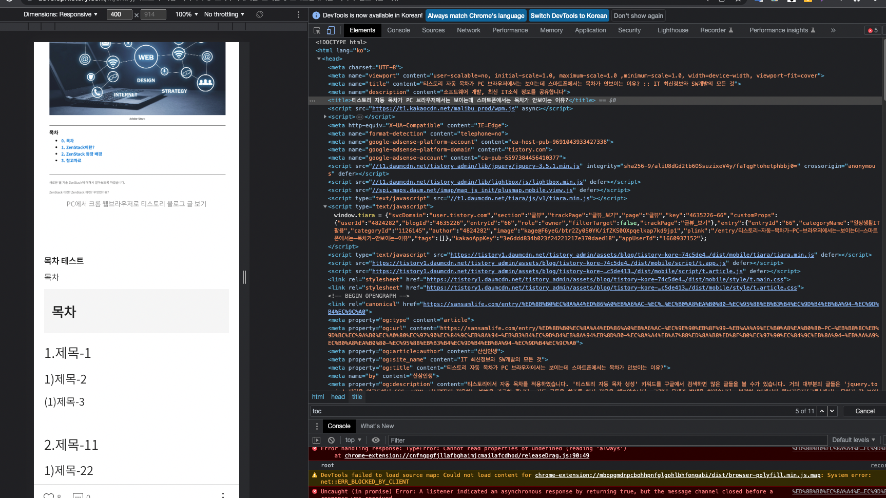 분명히 PC에서의 웹브라우저(크롬)에서는 목차가 잘 보이는데,