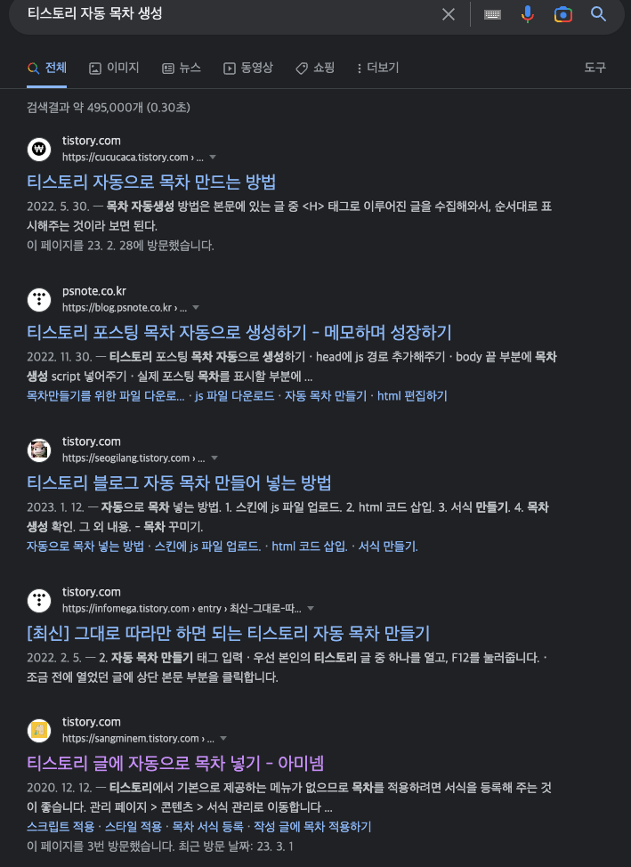'티스토리 자동 목차 생성' 키워드를 구글에서 검색하면