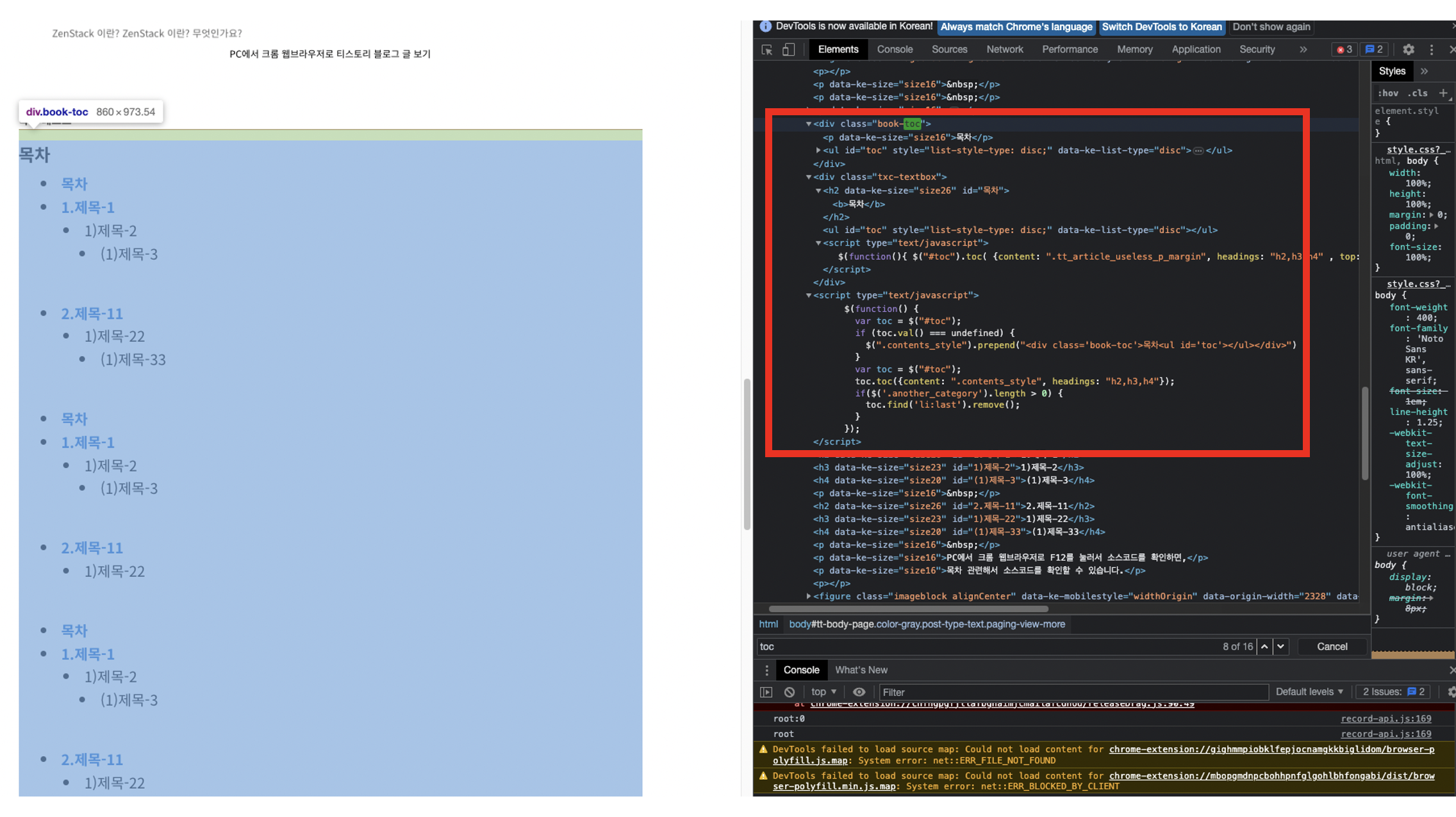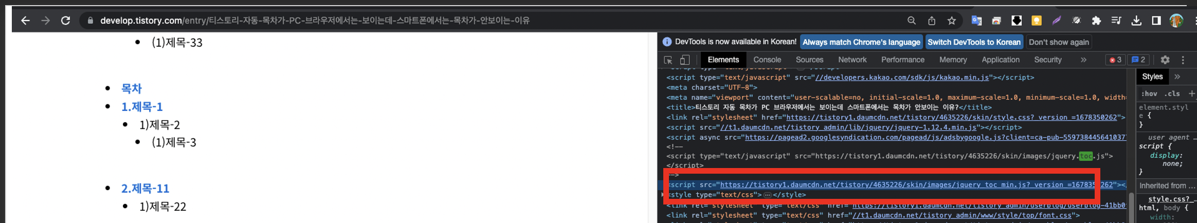 분명히 PC에서의 웹브라우저(크롬)에서는 목차가 잘 보이는데,