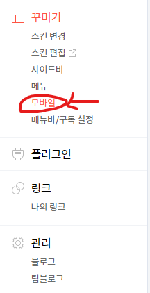 왼쪽 메뉴에서 '꾸미기 > 모바일' 메뉴로 진입을 합니다.