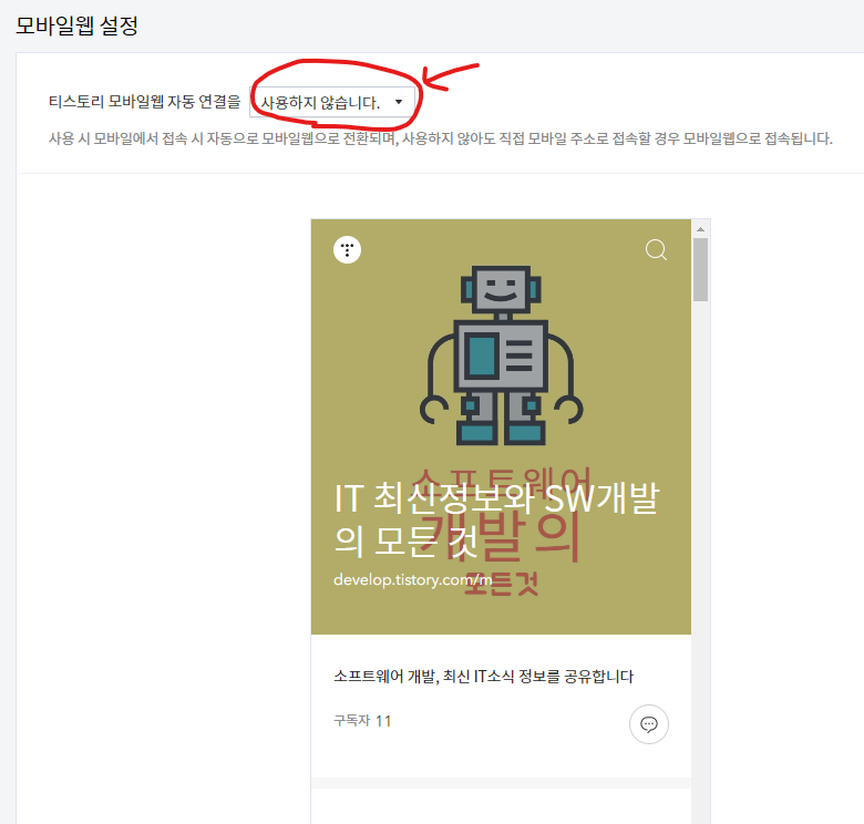 티스토리 모바일웹 자동 연결을 '사용합니다' 로 디폴트 설정이 되어 있습니다.