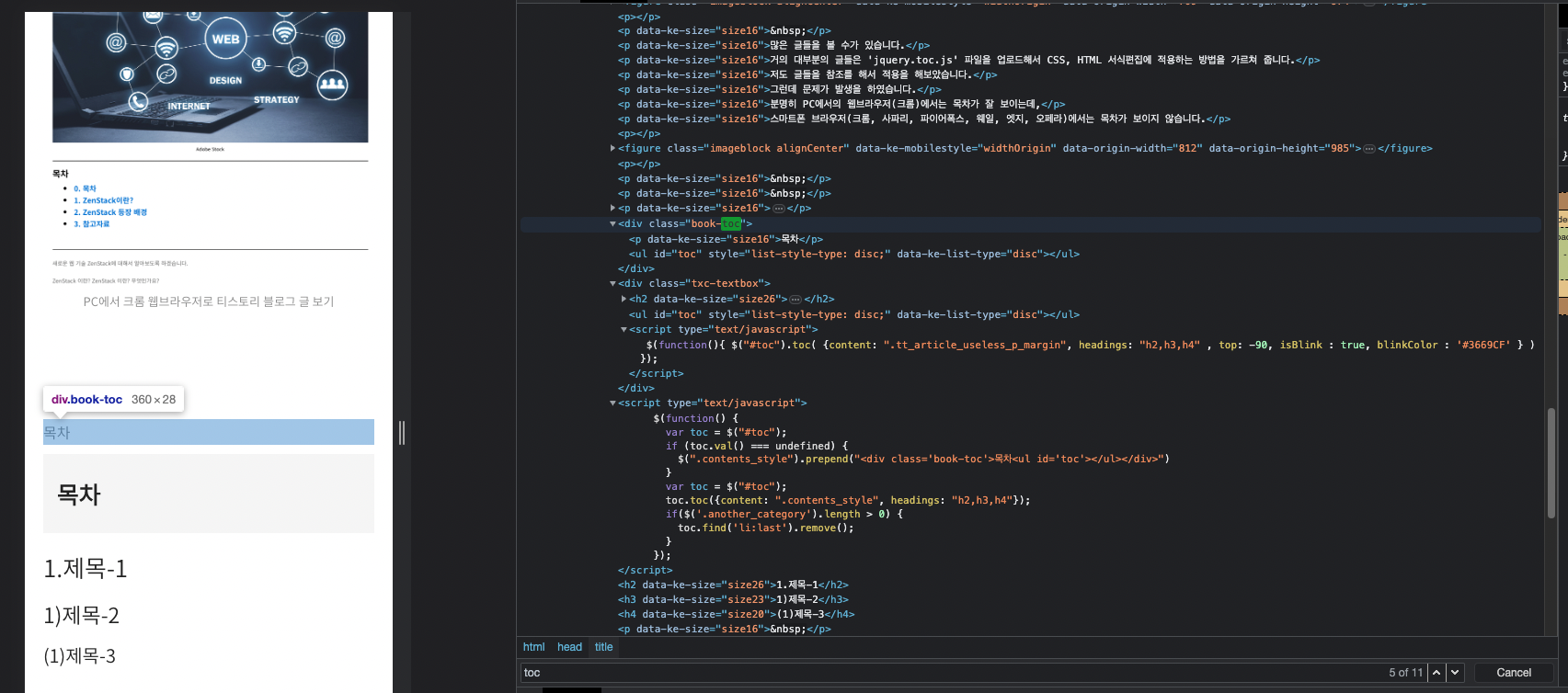 거의 대부분의 글들은 'jquery.toc.js' 파일을 업로드해서 CSS, HTML 서식편집에 적용하는 방법을 가르쳐 줍니다.