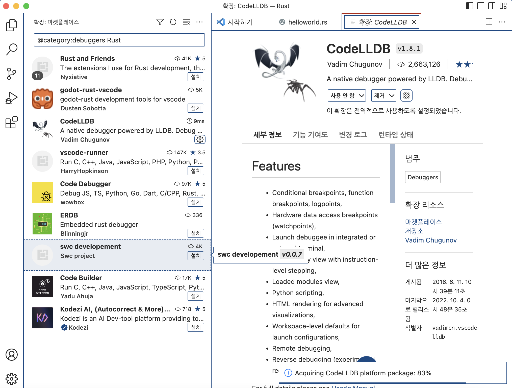 Rustc 컴파일러와 디버깅에 대한 확장 플러그인을 설치하도록 하겠습니다.