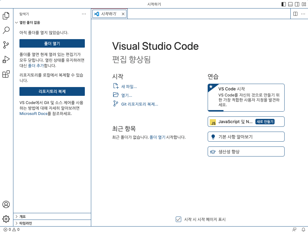 터미널 프로그램에서 'code .'을 실행하면 Visual Studio Code가 실행합니다.