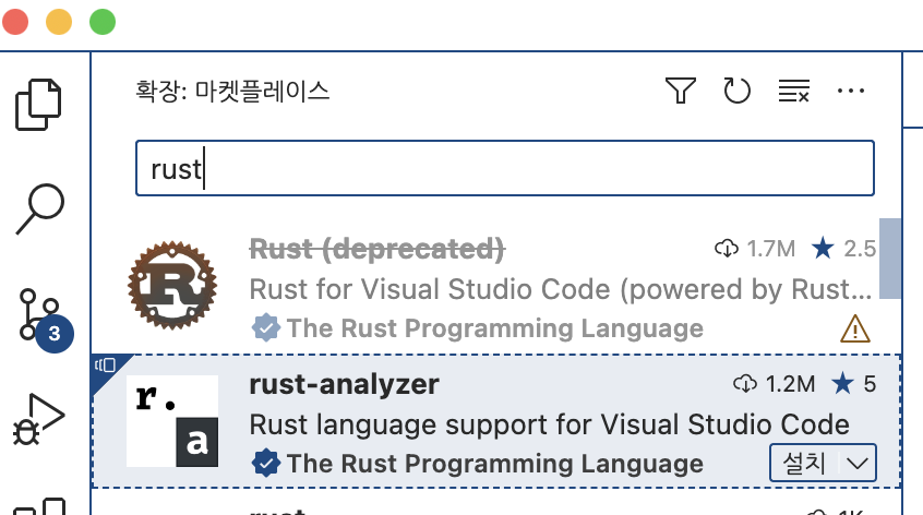'Rust'로 검색을 하면 'rust-analyzer' 가 검색되는데 같이 설치하겠습니다.