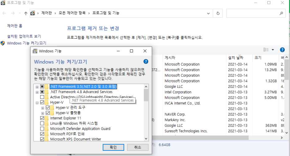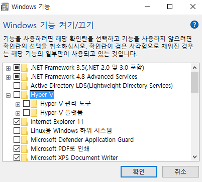 3. 'Hyper-V'가 활성화되어 있는게 보이는데 이것을 '체크해제'를 해줘야 한다. '확인'버튼 클릭한다.
