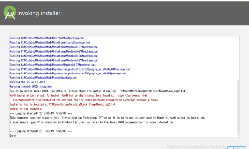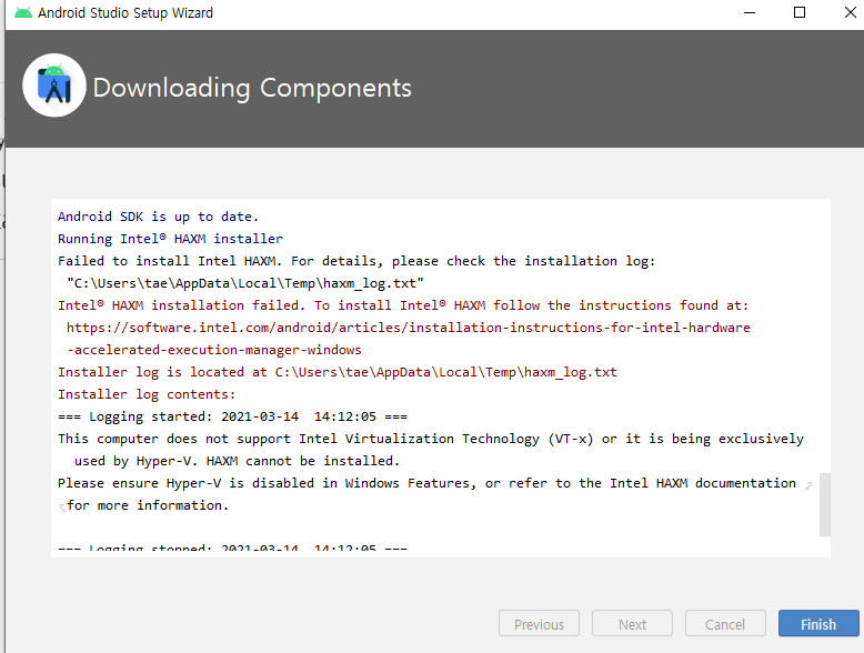 Android SDK is up to date. Running Intel® HAXM installer Failed to install Intel HAXM. For details, please check the installation log: "C:\Users\tae\AppData\Local\Temp\haxm_log.txt" Intel® HAXM installation failed. To install Intel® HAXM follow the instructions found at: https://software.intel.com/android/articles/installation-instructions-for-intel-hardware-accelerated-execution-manager-windows Installer log is located at C:\Users\tae\AppData\Local\Temp\haxm_log.txt Installer log contents: === Logging started: 2021-03-14 14:12:05 === This computer does not support Intel Virtualization Technology (VT-x) or it is being exclusively used by Hyper-V. HAXM cannot be installed. Please ensure Hyper-V is disabled in Windows Features, or refer to the Intel HAXM documentation for more information. |