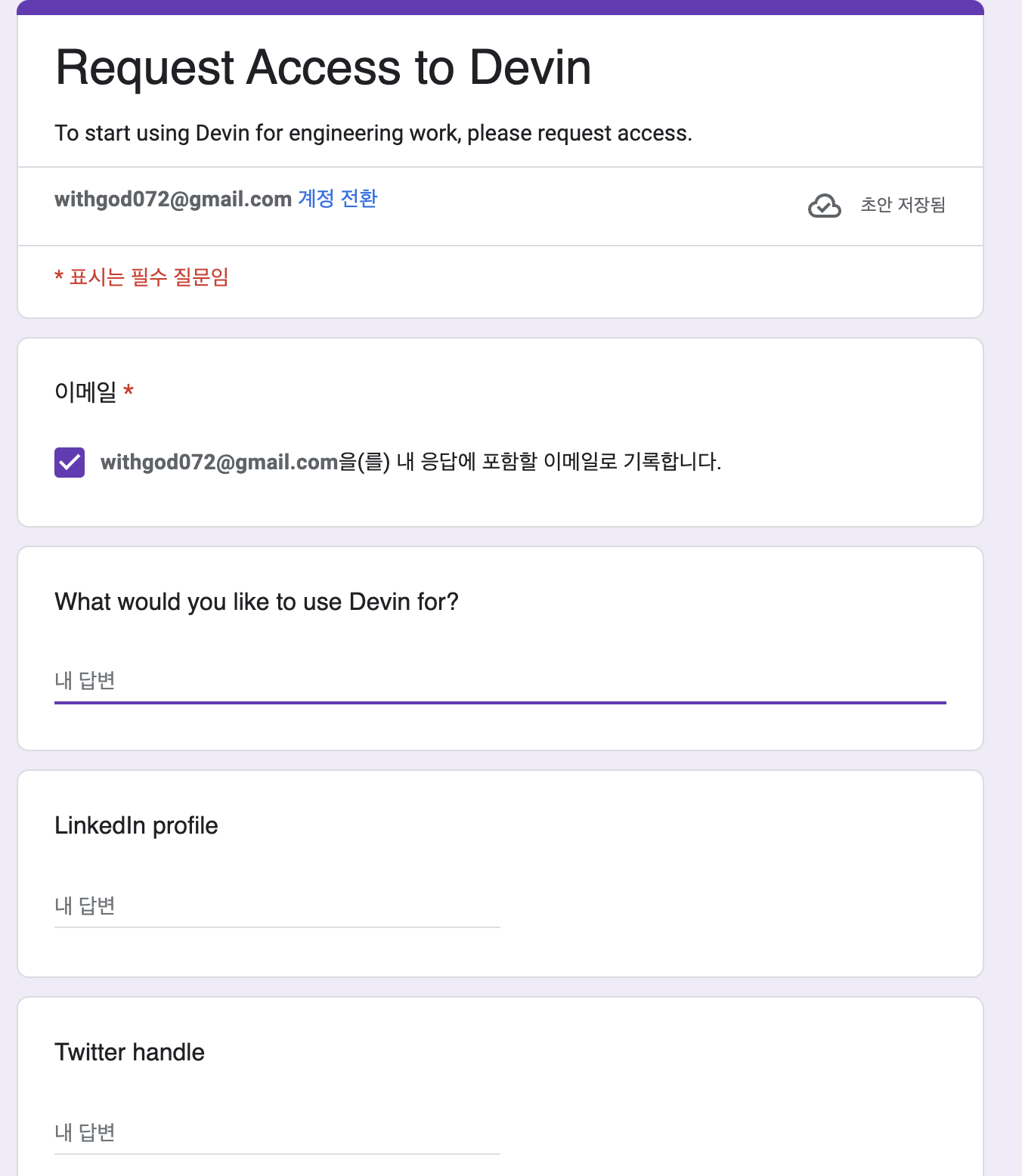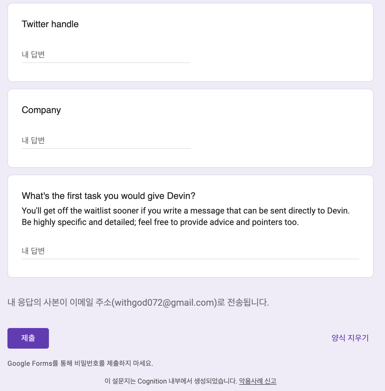 작성완료후에 '제출' 버튼을 클릭하면 완료입니다.