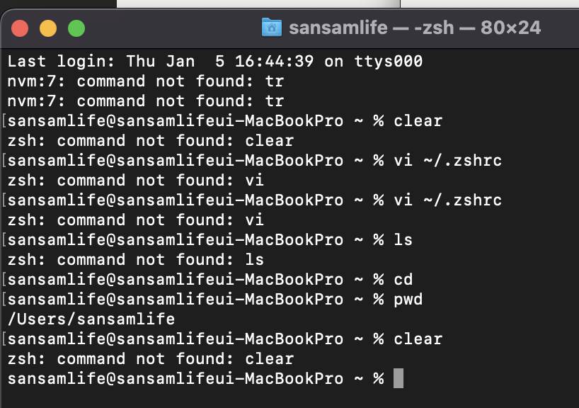| nvm:7: command not found: tr nvm:7: command not found: tr zsh: command not found: clear zsh: command not found: vi zsh: command not found: ls zsh: command not found: clear |