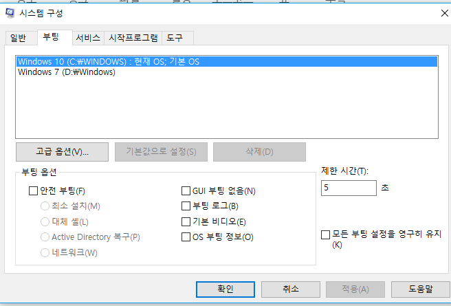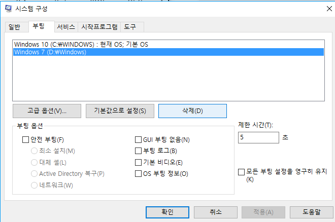 4. '현재 OS: 기본 OS'가 표시된 운영체제가 현재 사용중인 Windwos입니다. 이외의 운영체제는 선택해서 삭제 버튼을 클릭하여 제거합니다.