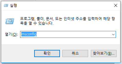 2.Windows 로고 키 + R 키를 누른후 실행창에서 msconfig를 입력하고 확인 버튼을 클릭한다