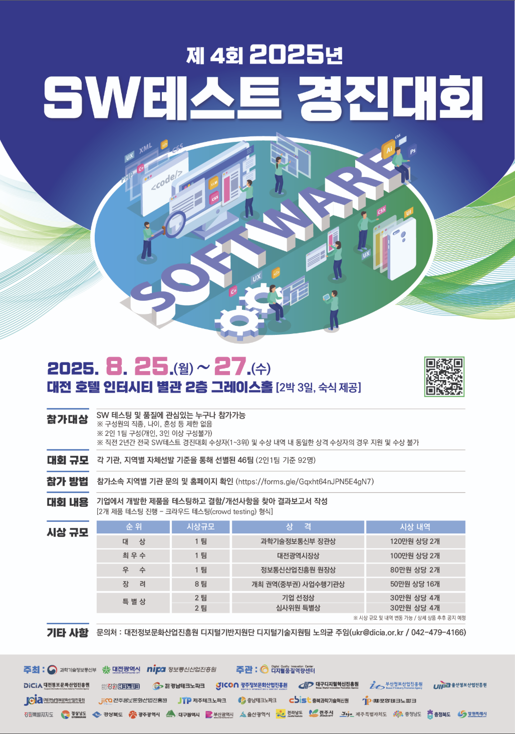 2025년 제4회 SW테스트 경진대회호남권 참가자 모집 안내!소프트웨어 품질 향상과 테스트 인식 확산을 위한전국 최대 규모의 SW 테스트 경진대회!여러분의 실력을 발휘할 기회, 지금 도전하세요!대회 개요대회명: 2025년 제4회 SW테스트 경진대회본선 일정: 2025년 8월 25일(월) ~ 8월 27일(수) 2박3일본선 장소: 대전 호텔인터시티 그랜드볼룸대회 혜택: 본선 참가팀 전원 숙식 제공 / 수상팀 상장(과기부장관상 외 14팀) 및 상품 수여📌 호남권 예선 참가자 모집모집 기간: 2025년 6월 23일(월) ~ 7월 18일(금)모집 대상: 광주·전남·전북·제주 지역 거주자 및 해당 지역 산·학·연·관 종사자 또는 대학(원)생모집 인원: 팀(2인 1팀) 단위로 총 10팀 이내사전교육 및 예선: 20..